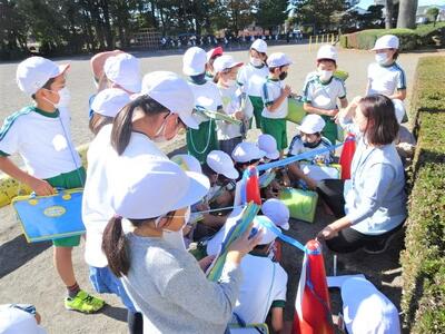 【1年生】1枚目と2枚目の写真は、2年生に招待された「あきまつり」を楽しんでいる様子です。2年生が考えたいろいろなお店を巡って、いろいろな遊びをしたり、たくさんの景品をもらったりしました。手提げ袋いっぱいの品物や景品を見せてくれました。