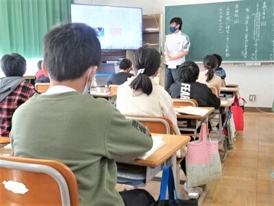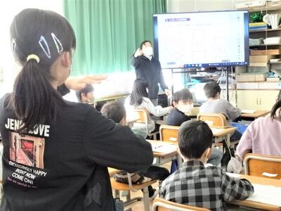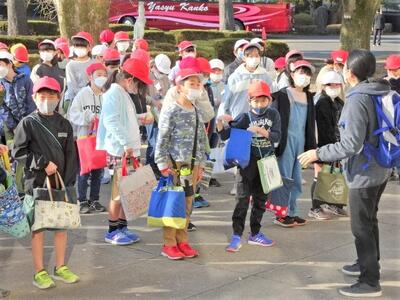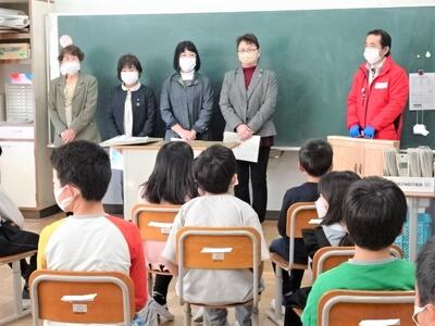 集会では、お一人お一人に児童代表の子どもたちがお礼の手紙を読んでお渡ししました。教室の子どもたちは、オンラインで生中継しています。