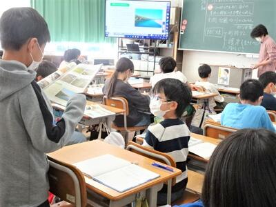 【3年生】1枚目と2枚目の写真は、社会科の時間の様子です。「物をつくる仕事ではたらく人たち~工場の仕事~」の学習も、まとめの時期になり、新聞形式でまとめたり、映像教材を見ながらまとめのプリントを行ったりしていました。3年生から始まった社会科の学習にも、すっかり慣れた3年生です。