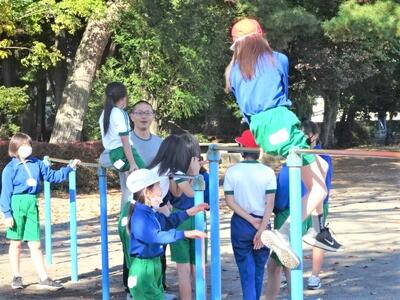 【1年生】1枚目の写真は、生活科の時間の様子です。「たのしい あきいっぱい」という単元の学習で、校庭のふるさとの森で「あき」を探しながら、はっぱや木の実で遊んでいるところです。大きなたくさんのトチノキの落ち葉を集めたり、どんぐりや松ぼっくりを集めたりしていました。