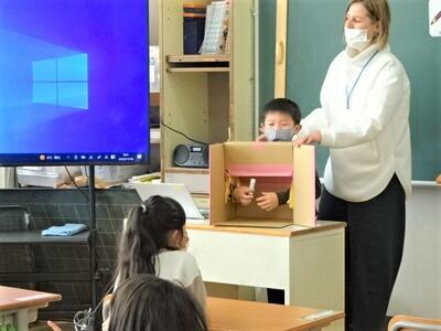 【1年生】1枚目と2枚目の写真は、外国語活動の時間の写真です。段ボールのはこの中に手を入れて、何かをさわっていますね。箱の中には、1枚目の写真にあるような文房具が一つ入っていて、それをあてるというアクティビティーです。おそるおそる手を入れながらも、しっかりと当てることができました。