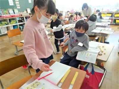 【2年生】1枚目の写真は、国語の時間の様子です。「馬のおもちゃの作り方」という教材を学習しています。おもちゃの作り方の説明に、どんな工夫がされているか考えながら、実際に馬のおもちゃを作ってみる活動を行っています。もちろん最後は、自分作成したおもちゃの作り方の説明文を書きます。