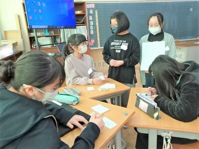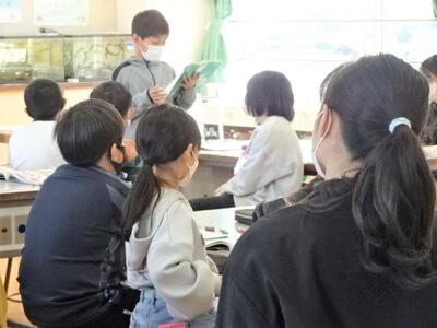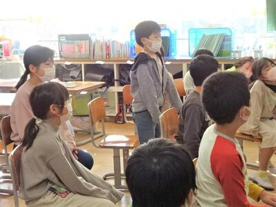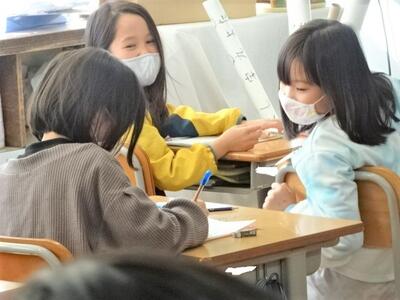 【3年生】1枚目の写真は、国語の時間の一コマです。「はんで意見をまとめよう」という題材の学習で、1年生に本好きになってもらうための音読会を計画しています。今日は、グループ同士で予行練習を行い、お互いに気をつけることや工夫すると良いことを話し合っていました。