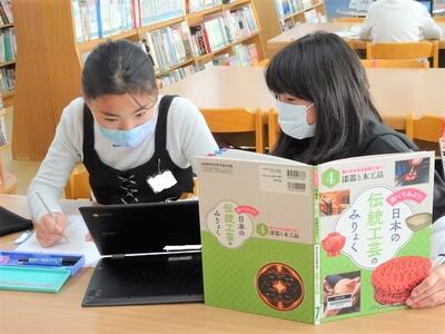 【4年生】4年生では、今、国語の「中心となる語や文を見つけて要約し、調べたことを書こう」の学習の最盛期を迎えています。日本には様々な伝統工芸品があります。子どもたちは、自分で選んだ伝統工芸について、図書やタブレットを使って調べ、自分の言葉でリーフレットにまとめています。