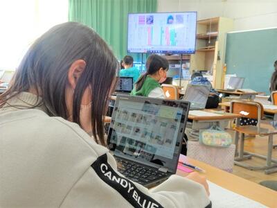 【5年生】1枚目と2枚目の写真は、図画工作の時間の様子です。「まだ見ぬ世界」という題材での学習です。1枚目の写真は、画用紙に写真を貼り、そこから周りの様子を工夫して表しているところです。2名目の写真は、パソコンを使って下絵(完成予想図)を作っている様子です。