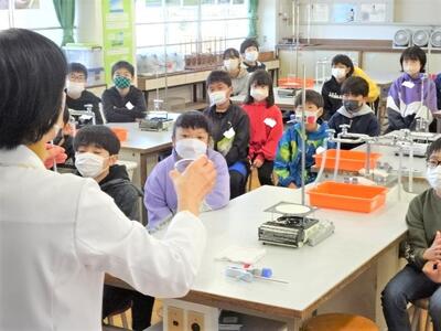 【4年生】1枚目の写真は、理科の時間の一場面です。「みんなで使う理科室」という単元の学習で、これからの理科の実験等で使用する道具の扱い方について学んでいるところです。スタンドやアームの部分、試験管やビーカーなどを設置する場所などを確認しました。