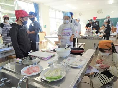 【6年生】1枚目の写真は、家庭科の調理実習の様子です。昨日の2組に続き2クラス目です。「まかせてね 今日の食事」という単元名です。野菜を切ってからゆでて、ベーコンに巻いてフライパンで焼いていきます。「ベーコンの野菜巻き」です。おいしそうにできあがりました。