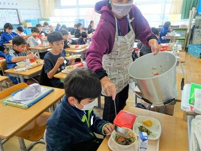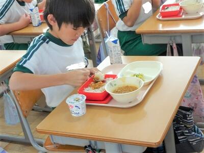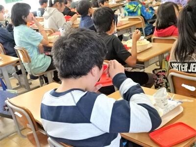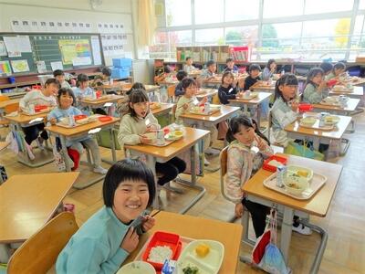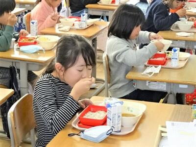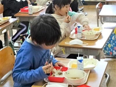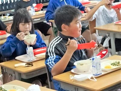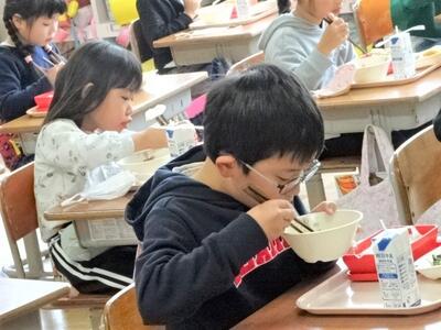 15日(火)には、さくら市から寄贈された「牛肉」を使った『すきやき煮』を、また、16日(水)には、JAから寄贈された「もちむぎ」をいただきました。地元のものをおいしくいただき、子どもたちは大満足です。