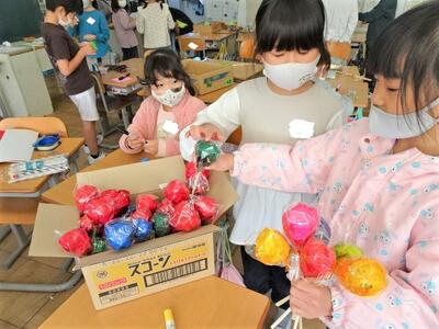 【2年生】生活科の「あきまつり」の準備が進んでいます。1枚目の写真は、リンゴ飴屋さんです。ラップでくるんで本物のようです。また、2枚目の写真は段ボールで作ったビー玉のコースです。「あきまつり」では1年生を招待します。1年生が喜んでくれるように頑張っています。