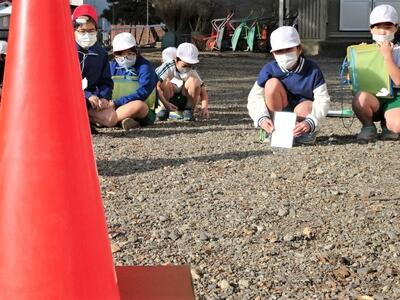 【3年生】1枚目の写真は、理科の学習の様子です。「光のせいしつ」という単元の学習で、カラーコーンに設置した段ボールの的に温度計を取り付け、鏡で反射させた光を一定時間あてて、どのくらい温度が上昇するのかを実験しています。自分の予想と比べながら結果を見守っています。