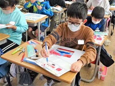 【4年生】1枚目の写真は、図画工作の時間の様子です。「わすれられないあの時」という題材の学習で、生活の中で心に残っていることから表したい様子を浮かべ、そのときに感じた気持ちに合う形や色を見つけながら絵に表す活動です。子どもたちは、いろいろと考えながら、画用紙に描き始めていました。