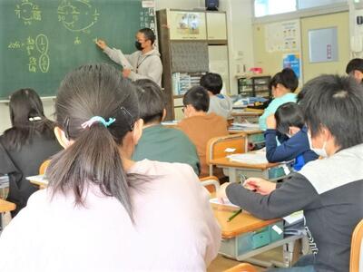 【5年生】1枚目と2枚目の写真は、算数の時間の一コマです。「分数のたし算、ひき算を広げよう」という単元の学習も、まとめが近くなってきました。今日は、分数を用いて時間を表す方法について学習しています。表を活用したり、友だちと相談したりして、習熟を高めようとしています。