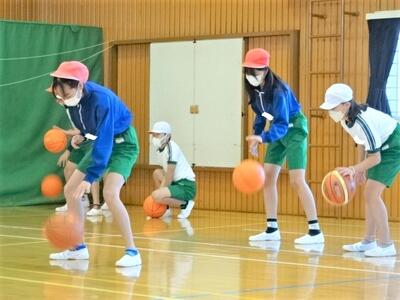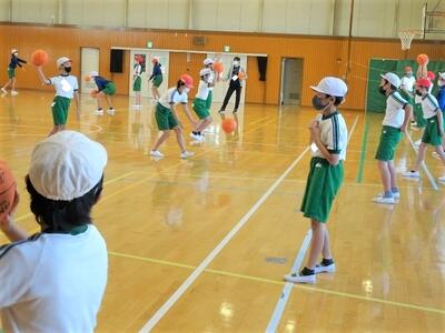 【6年生】体育の「バスケットボール」の活動が始まりました。今は、いろいろなパスやドリブルのやり方を教わりながら練習を行っているところです。ボールにたくさんさわり、ボールになれることから始めています。そろそろチームに分かれての練習が始まります。