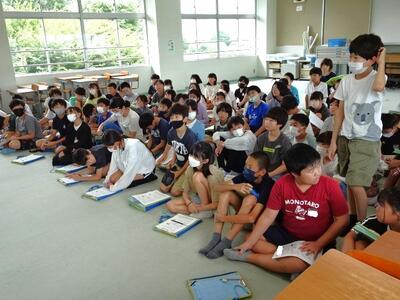 【5年生】5年生の教室にだれもいなかったので、探してみたら学習室に集まって真剣に話を聞いているところでした。海浜自然の家への宿泊学習が迫っています。今日は、全体で決まりなどについて知りました。
