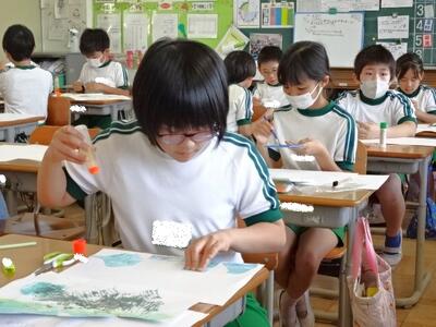 【2年生】1枚目の写真は、図画工作の「ふしぎなたまご」の学習の様子です。不思議なたまごを半分に切って、生まれた物と一緒に台紙に貼っていきます。仕上がりが楽しみです。