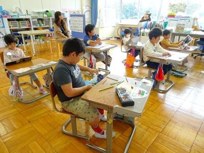 【1年生】1年生の生活科では、幼稚園・保育園の年長の園児の皆さんをお呼びして、交流会を行う計画があります。1枚目の写真は、その際の役割を決めているところです。