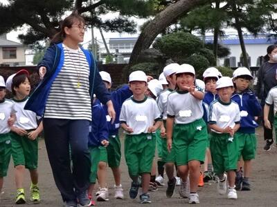 【1年生】1枚目の写真は、体育の時間の様子です。校内の持久走記録会が少しずつ近づいてきています。今日は、走るコースをゆっくりとはや歩きしました。