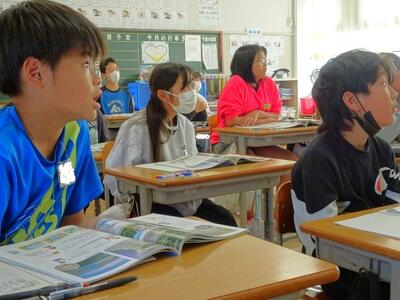 【4・5・6・7組】1枚目の写真は、国語の時間の様子です。自分の考えを発表しようとしている瞬間です。頑張っています。