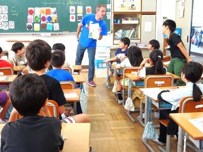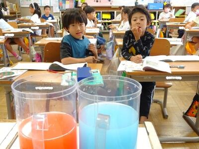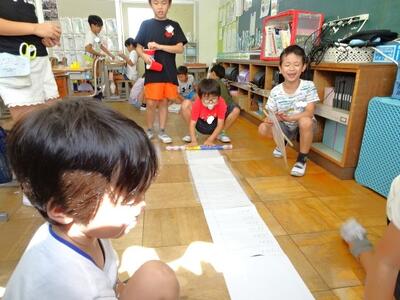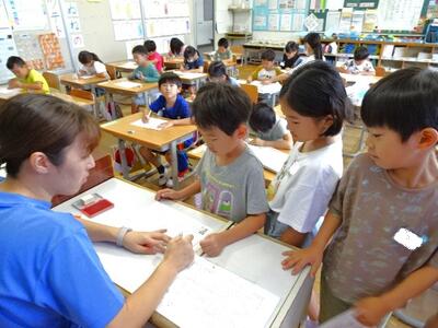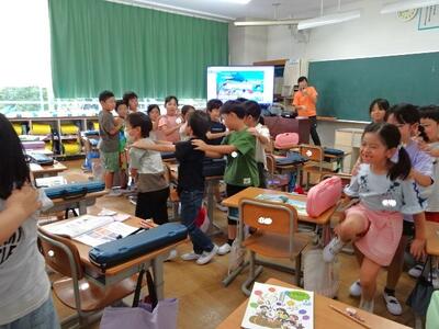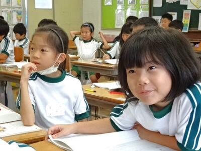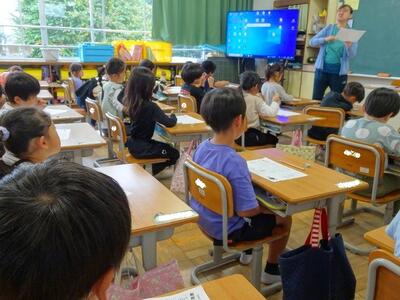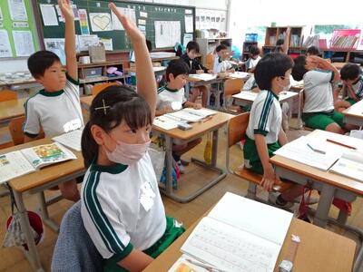 【1年生】1枚目の写真は、国語の「くじらぐも」の学習の様子です。子どもたちは「もっとたかく!もっとたかく!」というくじらぐもの台詞が大好きです。