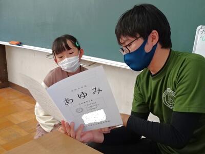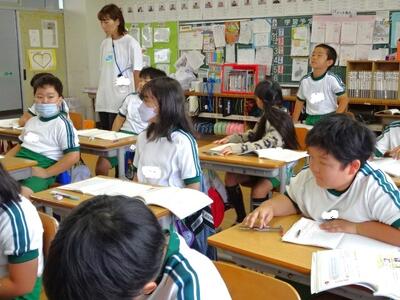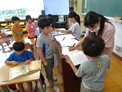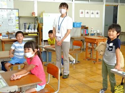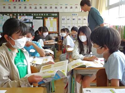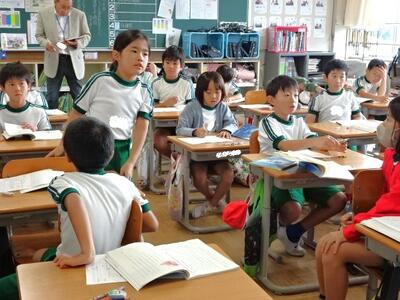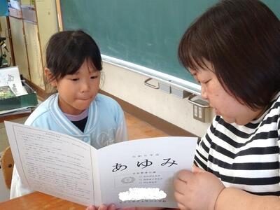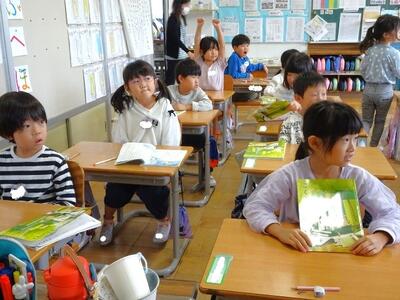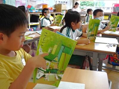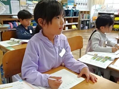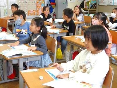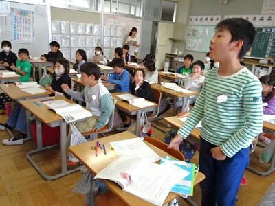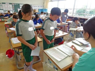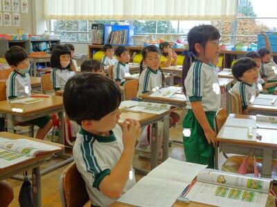 【2年生】1枚目の写真は、国語の「お手紙」の学習の様子です。がま君やカエル君、カタツムリ君など、役割を分担して音読を行っている場面です。