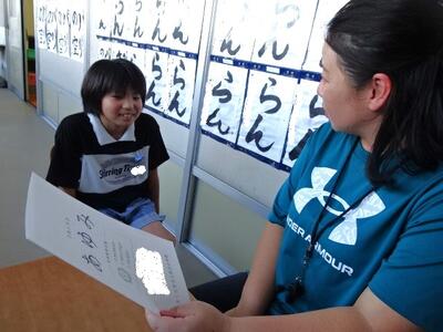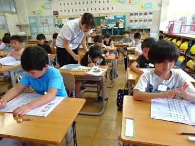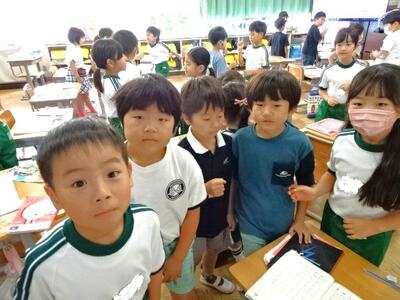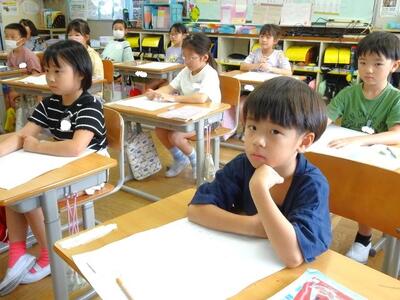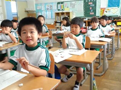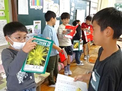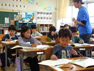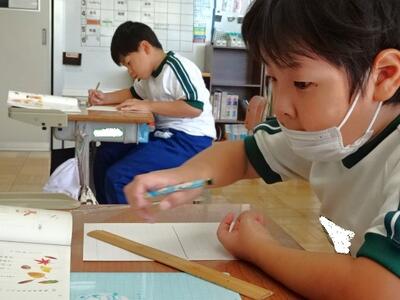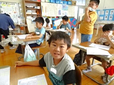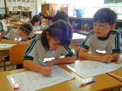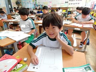 【1年生】1枚目の写真は、国語の「しらせたな、見せたいな」の学習の様子です。新しい単元の学習で、学校で見つけたものを、くわしく書いて知らせるという内容です。今日は、知らせ方学習をしました。