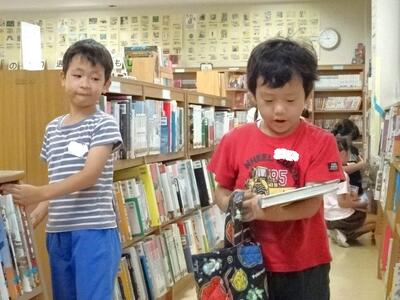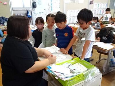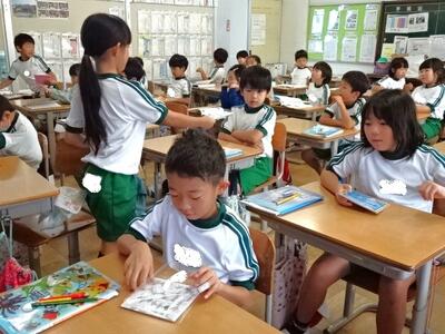 【2年生】1枚目の写真は、来週のすきま読書用の本を選んでいる様子です。図書室に入ると、みんな自分が読みたいジャンルの棚の方へちらばっていきます。お気に入りの本をゲットできたなか?