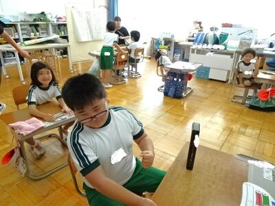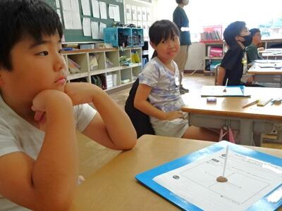【3年生】1枚目の写真は、「かげと太陽」の学習の様子です。今日は、日向と日陰の地面の温かさの違いについて調べました。日向に置いた温度計と日陰に置いた温度計、違いはあったかな?