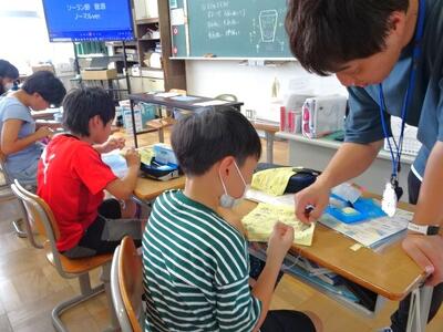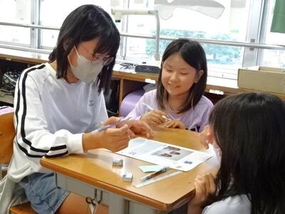 【5年生】1枚目の写真は、家庭科の「ひと針に心をこめて」の学習の様子です。だいぶ糸と針の扱いに慣れ、縫うことにも慣れてきました。小物作りの設計図に入った友だちもいます。