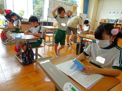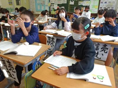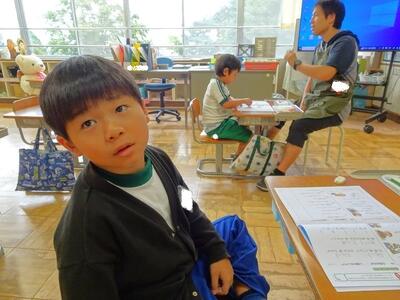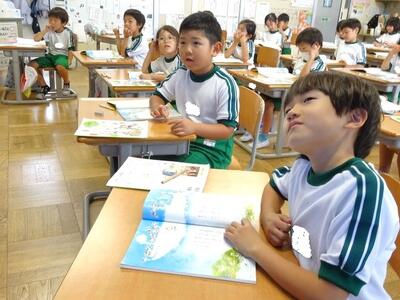【1年生】1枚目から3枚目の写真は、国語の「くじらぐも」の学習の様子です。子どもたちの台詞やくじらぐもの台詞を、どんなふうに読むと物語の世界に近づくのか、声に出して読みながら考えています。
