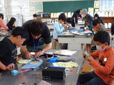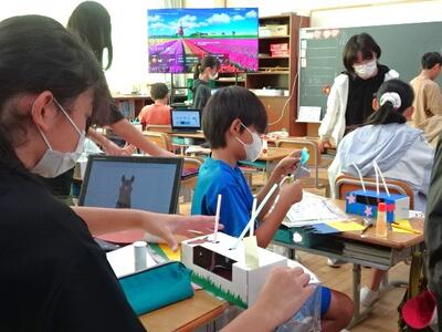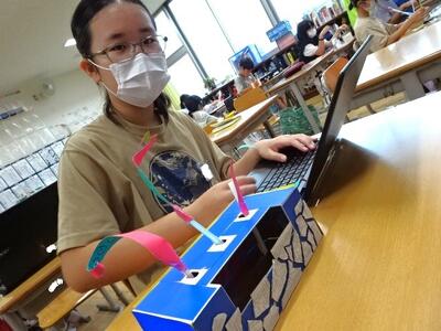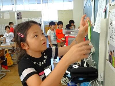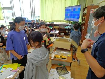 【3年生】1枚目の写真は、理科の「電気であかりをつけよう」の学習の様子です。天候が悪いために本来の学習ができないため、次の学習の準備を行っています。新しい実験キットを確認しました。