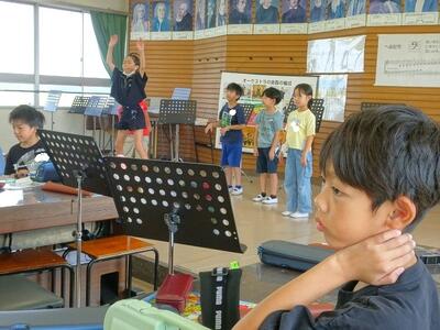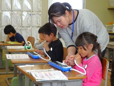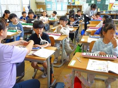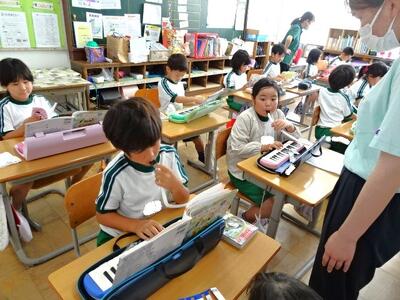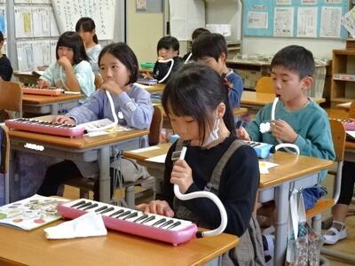 【4・5・6・7組】1年生も、鍵盤ハーモニカを吹くのに慣れてきました。音を出すのは、楽しいですね。