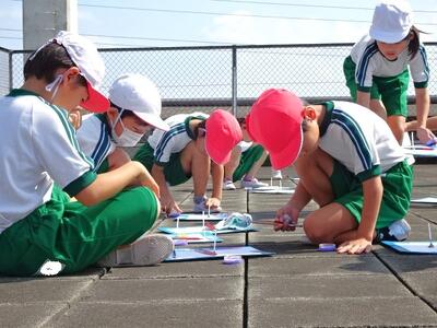 【3年生】1枚目の写真は、理科の「かげと太陽」の学習の様子です。今日の天気は晴れです。理科の時間には、前の時間に作った影を調べる観察道具をもって屋上に出かけました。
