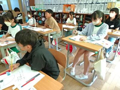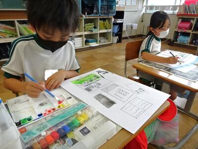 【絵画クラブ】今日のテーマは「生き物」です。学校で生き物を探して写真を撮り、絵に表しました。