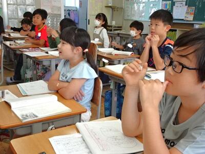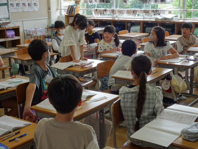 【4・5・6・7組】1枚目の写真は、国語の時間の様子です。自分の考えを発表しようとしている瞬間です。頑張っています。