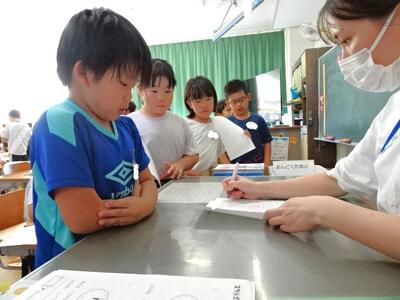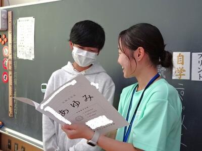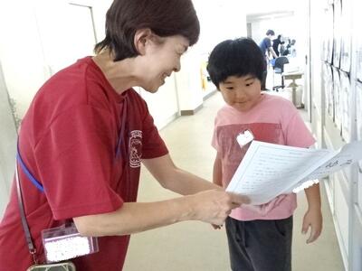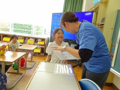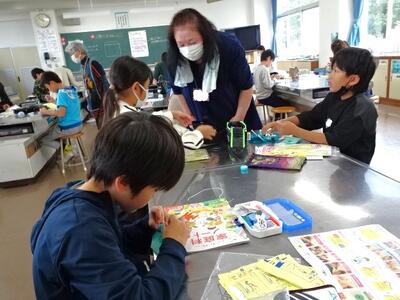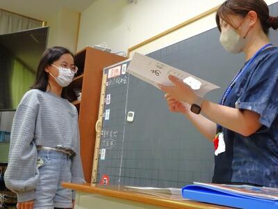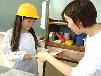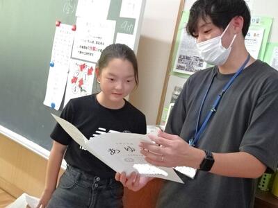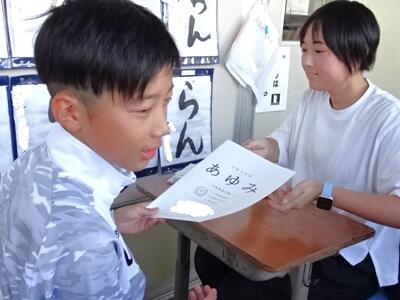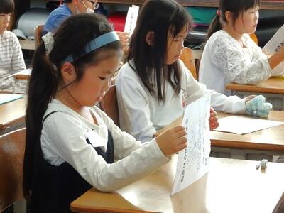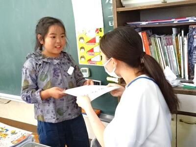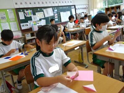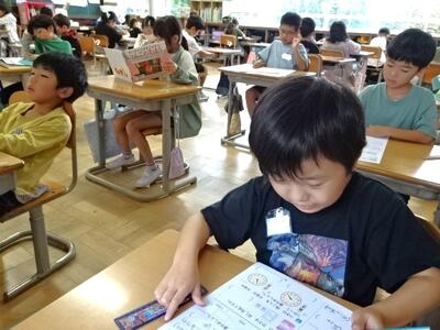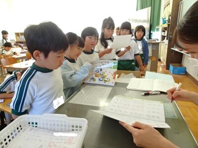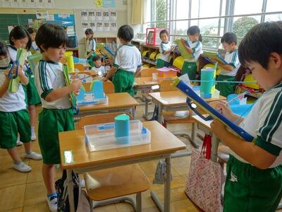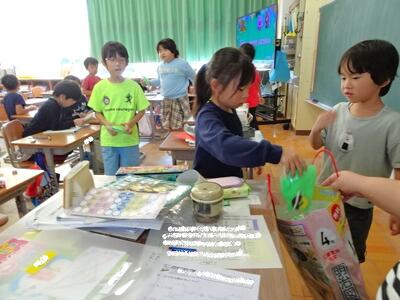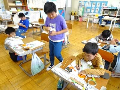 【1年生】1枚目の写真は、図画工作の「おってたてたら」の学習の様子です。今日は、出来上がった友だちの作品を鑑賞してまわっています。感心したところやすごいと思ったところをシートに記入しています。