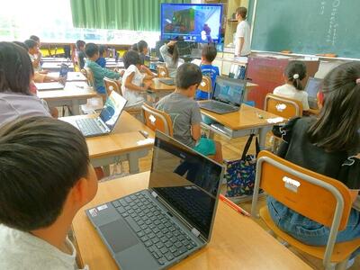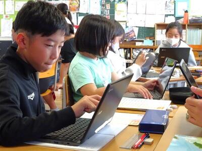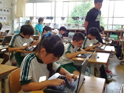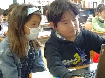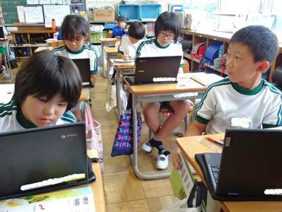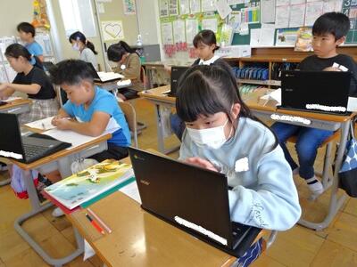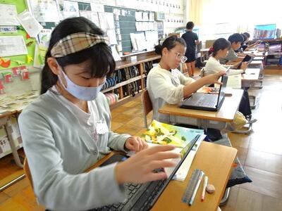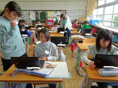【3年生】1枚目の写真は、国語の「ローマ字」の学習の様子です。みんなパソコンのキーボードをすごい勢いでたたいています。子どもたちは、ローマ字になれるが早いですね。