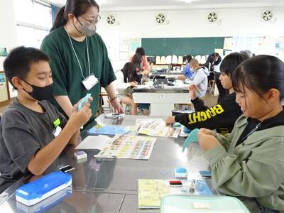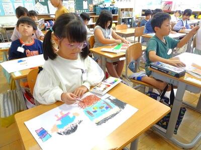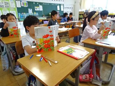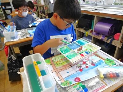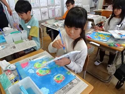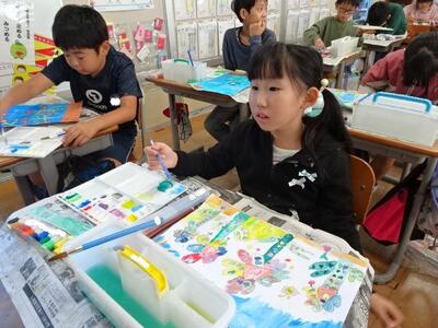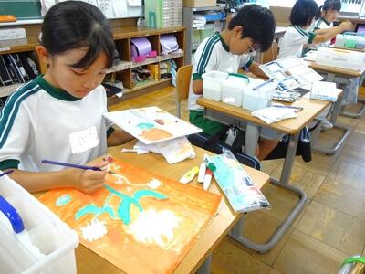 【4年生】1枚目の写真は、図画工作の「まぼろしの花」の学習の様子です。ついに完成に近づきました。色をぬったり、違う素材を貼り付けたりと自分の想いを表していました。