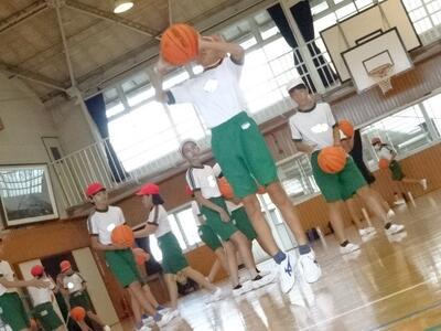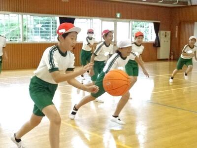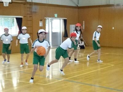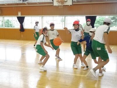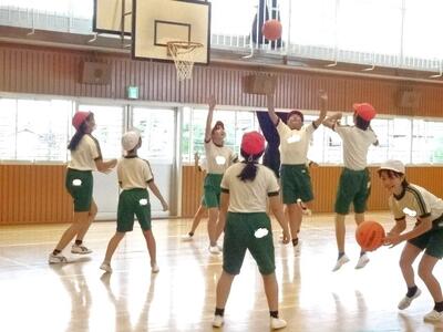 【6年生】1枚目の写真は、体育のゴール型のゲーム「バスケットボール」の学習の様子です。単元の始まりで、まずはボールの慣れたりパスやシュートの練習から始めました。