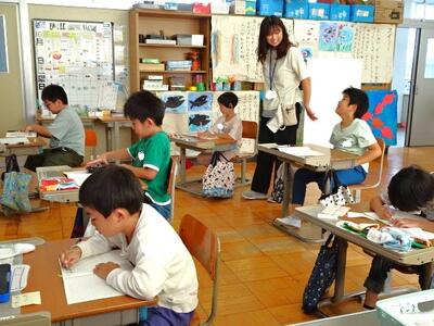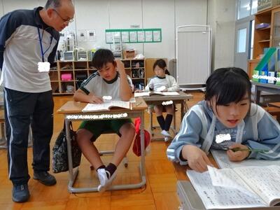 【4・5・6・7組】1枚目の写真は、2年生の国語の学習をしている様子です。後ろの6年生は、自分の課題の学習に熱心に取り組んでいます。
