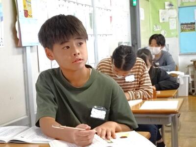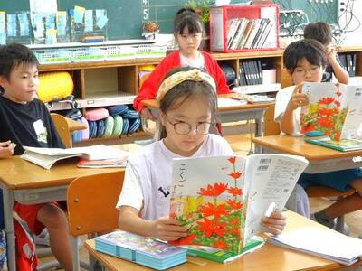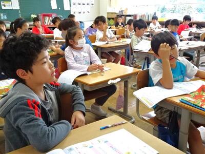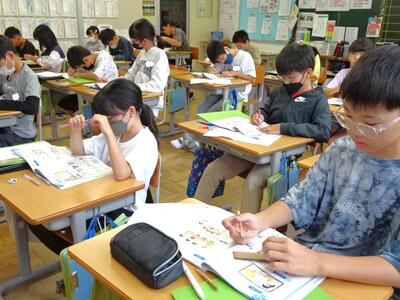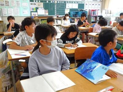 【5年生】1枚目から3枚目の写真は、国語の「たずねびと」の学習の様子です。下の教科書に入ってすぐの長文の物語です。物語の世界に浸りながら、登場人物の気持ちを想像しています。