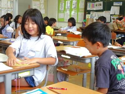 【工作クラブ】前回に引き続き、輪ゴムの割り箸でっぽう作りです。試行錯誤が、子どもたちの技術を高めます。