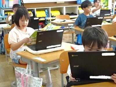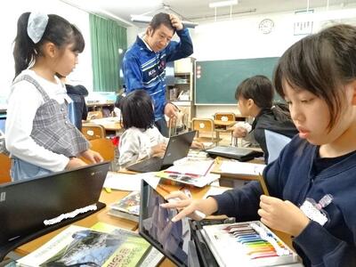【4年生】1枚目の写真は、国語の「未来につなぐ工芸品」の学習の様子です。社会科の学習で伝統文化について学習したので、今度は日本全国から伝統工芸の調べ学習を行っています。