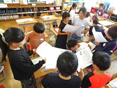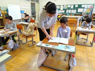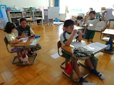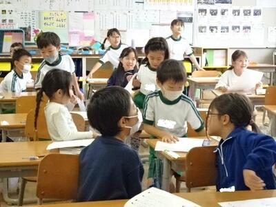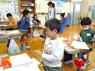 【1年生】1年生の生活科では、幼稚園・保育園の年長の園児の皆さんをお呼びして、交流会を行う計画があります。1枚目の写真は、その際の役割を決めているところです。
