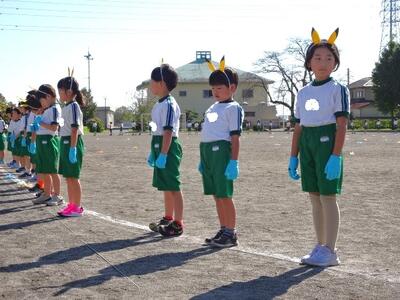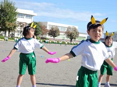 【1年生】1枚目の写真は、運動会で踊ったダンスの衣装を身に着けて、記念写真を撮っている様子です。腕のポケモンボールや頭のカチューシャを身に付けています。みんな笑顔です。