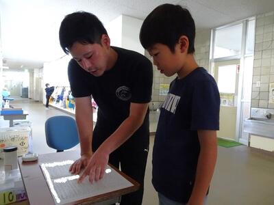 【6年生】1枚目と2枚目の写真は、理科の「月と太陽」の学習の様子です。今日は、太陽の光と月の位置による満ち欠けの様子を、グループごとに観察しました。
