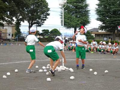 【みんなで遊ぼうクラブ】今日は、2組に分かれて「王様ドッジボール」です。王様はだれかな?