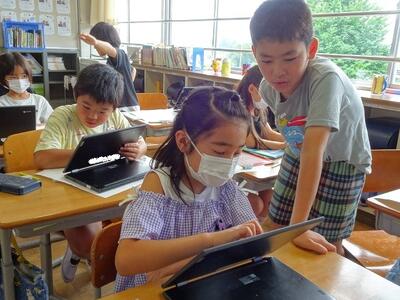 【4年生】1枚目の写真は、理科の「夏の夜空」の学習の様子です。もうすぐ夏休みです。晴れていれば、絶好の星の観察の機会です。今日は、星座盤の見方を学習しました。