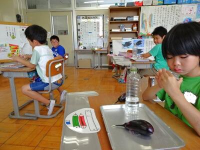 【4年生】1枚目の写真は、理科の「夏の生き物」の学習の様子です。春に種をまいたヘチマやヒョウタンですが、もう長さが測りきれないほど伸びていました。子どもたちも植物の生長に驚いています。