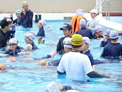 18日(木)に、6年生を対象にして着衣水泳を実施しました。日頃は消防署に勤務する水難学会の皆様に来ていただき、万が一水の中に入ってしまったときの対処方法について教わりました。大切なのは「ういてまて」ということです。子どもたちは、ペットボトルなどを持ちながら、浮いて待つ方法を練習し、最後は3分間、体を浮かせることにチャレンジしました。濡れた衣服の重さや動きづらさ、そして体を浮かせる方法を体験し、まさに命を守る学習となりました。
