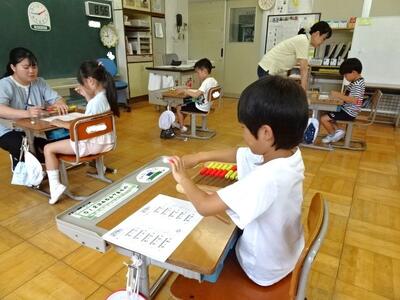 【4・5・6・7組】1枚目の写真を見てください。こちら側では書写を、向こう側では算数を行っています。